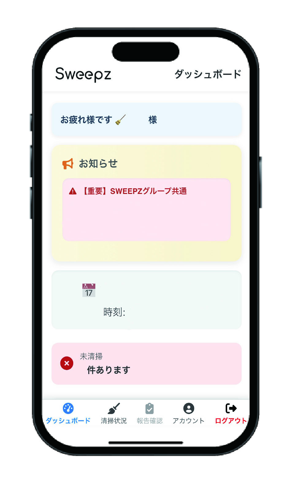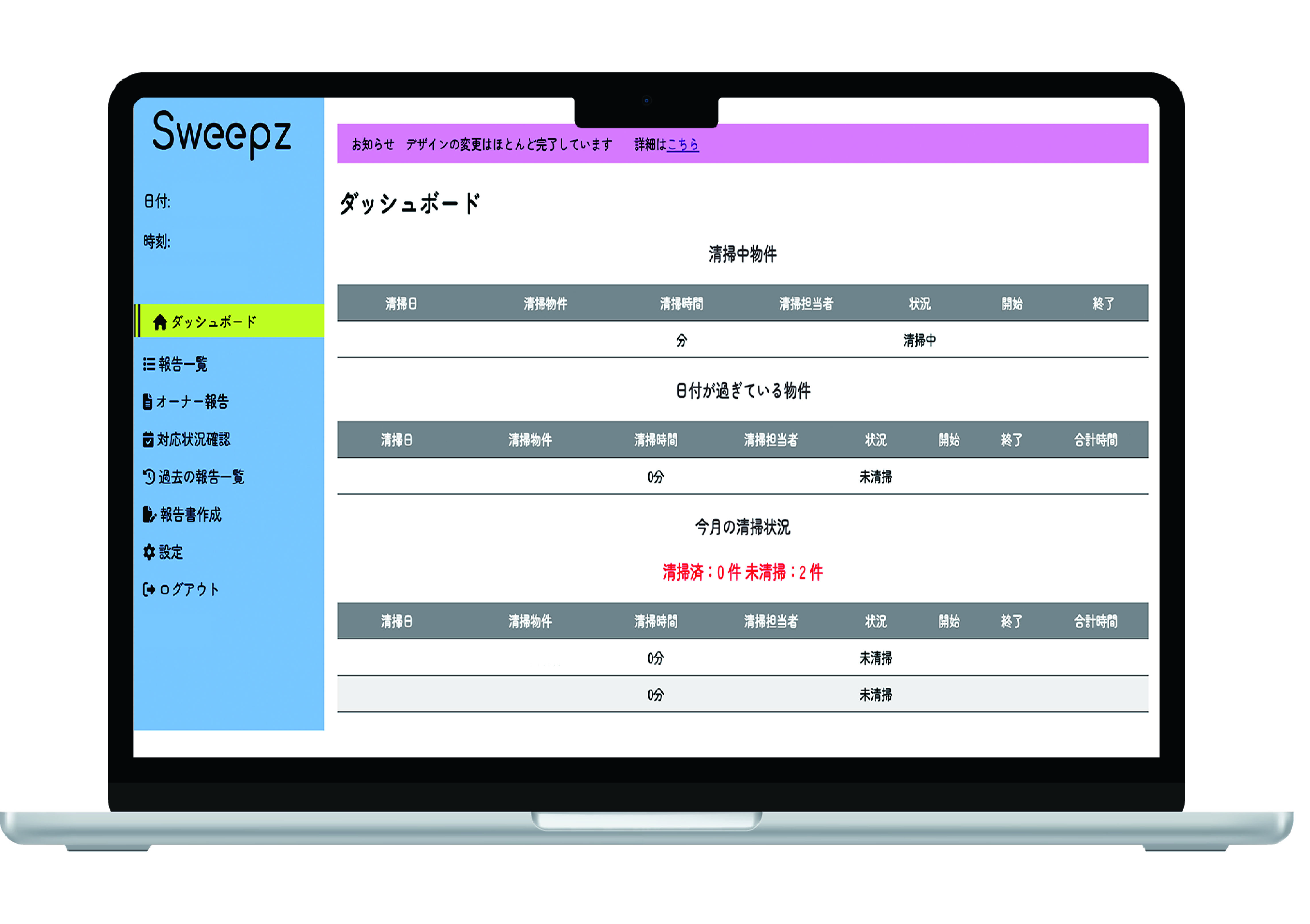 報告者は、ダッシュボードから「本日の清掃物件の開始」「昨日までの未清掃の物件」「明日以降の予定物件」を簡単に確認することができます。